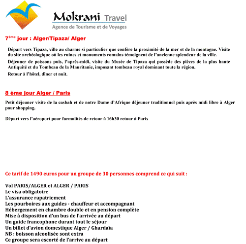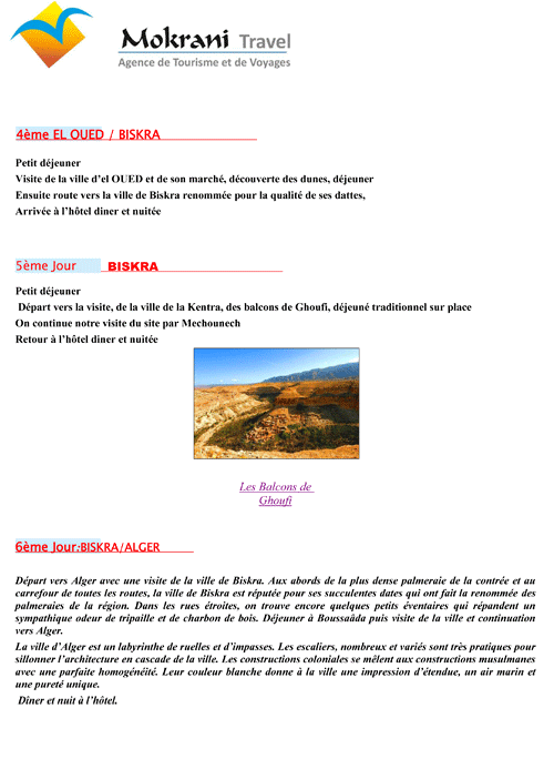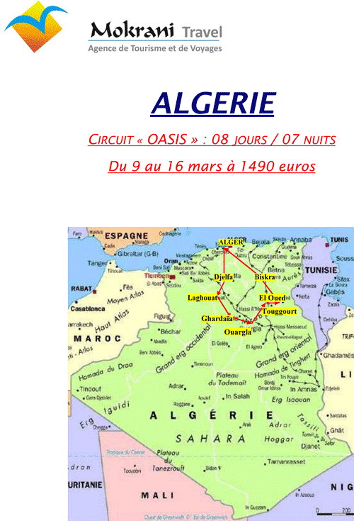 « En coopération avec l’agence MOKRANI TRAVEL à Alger, la Fédération Loisirs Solidarité des Retraités vous informe d’un prochain séjour découverte en Algérie découverte intitulé « circuit des OASIS »